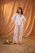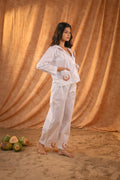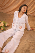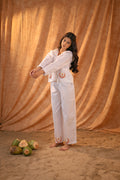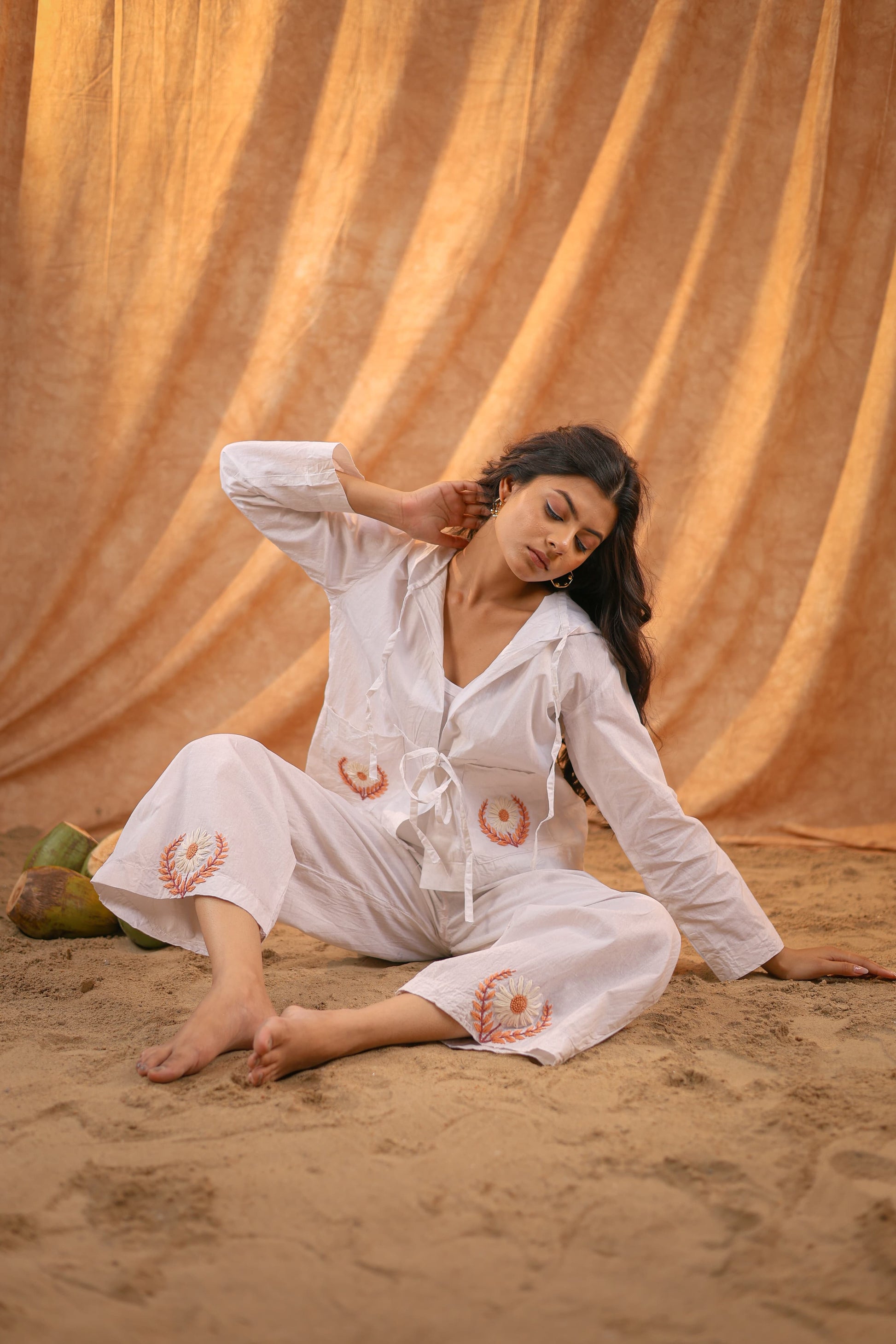 Made from breathable and soft linen fabric, this white co-ord set is a perfect blend of comfort and elegance. The set features a relaxed-fit hooded top with a front tie-up detail and subtle earth-toned embroidery near the pockets and pant hem. The straight-leg pants complement the top effortlessly, offering a relaxed silhouette that moves with ease.