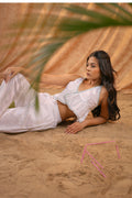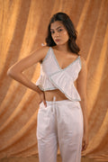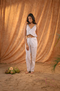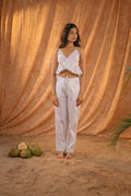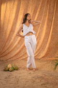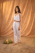 Made from breezy, breathable linen fabric, this elegant co-ord set features a sleeveless ruffle crop top with delicate trim detailing and matching relaxed-fit pants. Designed for all-day comfort and easy style, it’s a dreamy choice for those who love effortless, minimal aesthetics with a playful twist.