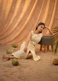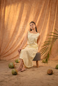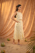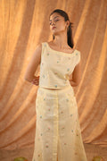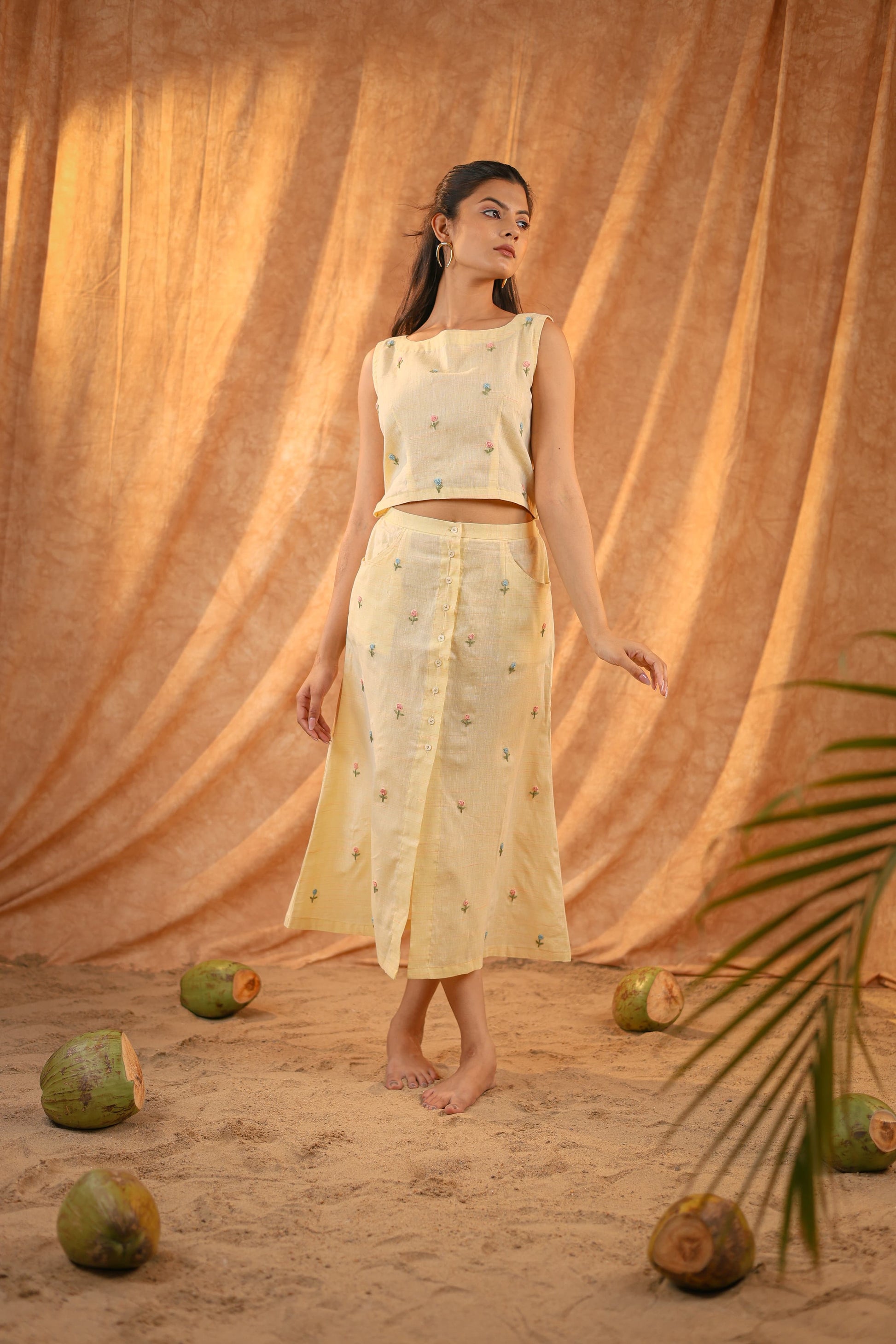 Crafted in a soothing pale yellow tone with delicate multicolor floral embroidery, this linen co-ord set feels like sunshine in fabric form. The top has a clean silhouette with minimal seaming, and the skirt flows gently for a breezy, flattering look. Lightweight and airy, it’s your go-to outfit when comfort meets charm.